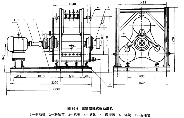 三筒慣性式振動磨機(jī)的構(gòu)造如圖10-4所示。它由電機(jī)1、聯(lián)軸節(jié)2、機(jī)架3、筒體4、激振器5、彈簧6相連通管7等部分組成。振動磨機(jī)的筒體由三個圓筒和兩塊側(cè)板構(gòu)成,通過兩側(cè)板將較大的上圓筒φ400xl040和較小的兩個下圓筒φ320xl040串聯(lián)在一起,而兩個下圓筒彼此互成并聯(lián),各圓筒內(nèi)壁上均鈕有襯板,以防筒壁磨損。激振器主要由偏心軸、可調(diào)式偏心塊、鑄鋼軸承座、雙列調(diào)心滾子軸承和迷宮式密封環(huán)等組成。電機(jī)1通過彈性聯(lián)軸節(jié)2帶動激振器5的偏心軸及安裝在軸兩側(cè)的偏心塊旋轉(zhuǎn),產(chǎn)生離心力,從而使坐落在彈簧上的筒體產(chǎn)生高頻小幅振動。物料和水不斷地從上圓筒的給料口加入,物料在筒內(nèi)粉磨介質(zhì)的頻繁沖擊和研磨作用下被磨細(xì),完成一段粉磨,而后經(jīng)過排料連通管分別流入下部兩個小圓筒內(nèi)進(jìn)行第二段粉磨,粉磨好的合格產(chǎn)品從小圓筒的排料口排出。整個粉磨作業(yè)為連續(xù)作業(yè)。
