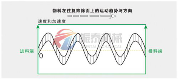 具體搖擺直線篩作業(yè)時(shí)物料的運(yùn)動(dòng)軌跡與滯留時(shí)間可以通過(guò)下圖及右圖來(lái)說(shuō)明: